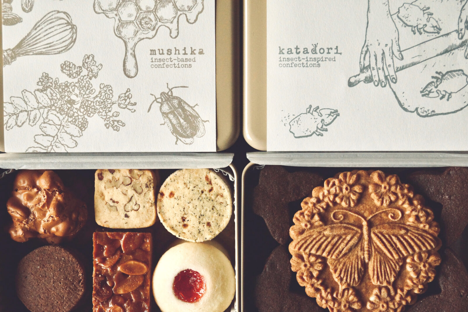 灯螂舎は前回(第5回)出店時に引き続き、昆虫モチーフの昆虫不使用菓子・katadoriシリーズを中心に、東京むし作品展でご好評いただいたクッキー缶もお持ちいたします。