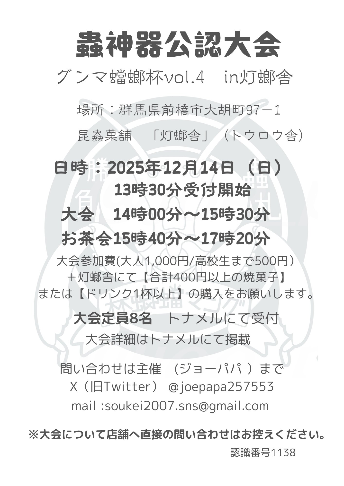 12月14日(日)は、ジョーパパ(@joepapa257553)さん主催の蟲神器公認大会《グンマ蟷螂杯》開催に伴う店舗貸切営業のため、12時〜17時の間は大会参加者様以外はご入店いただけません。