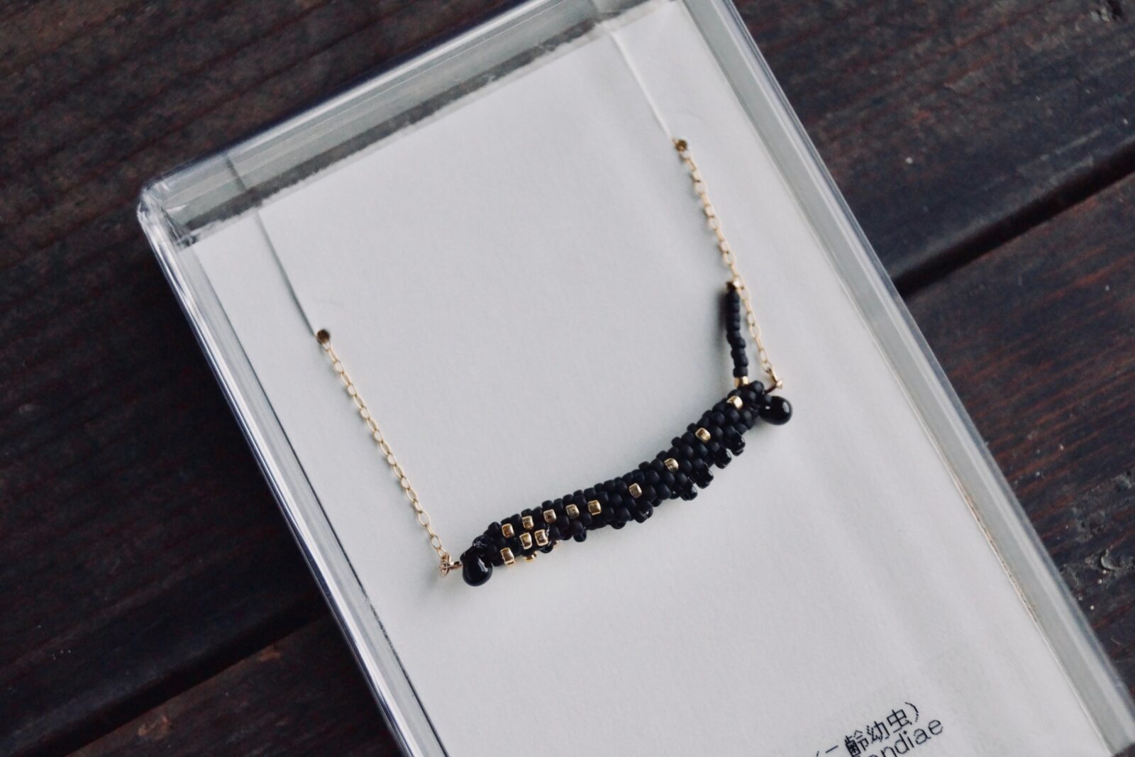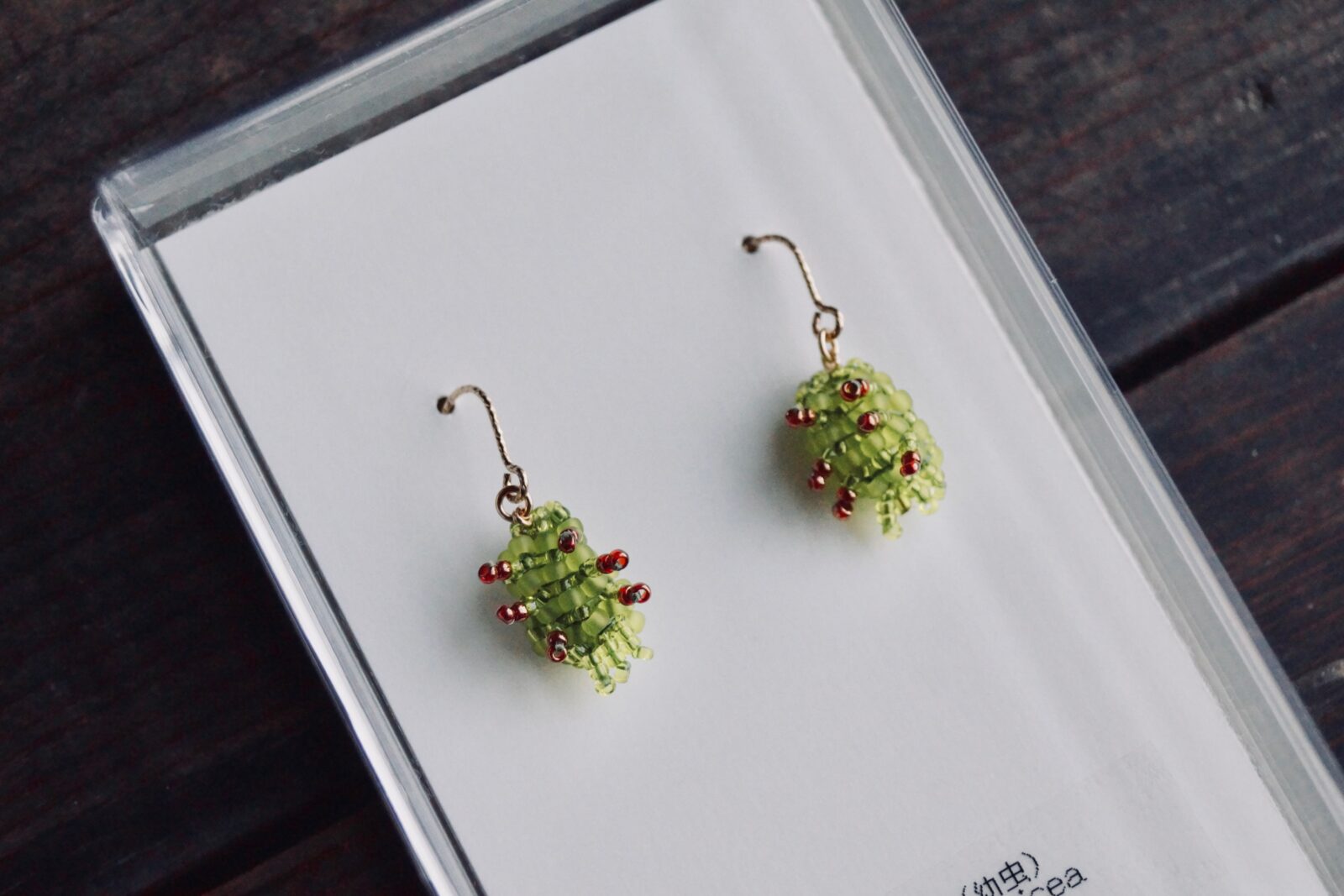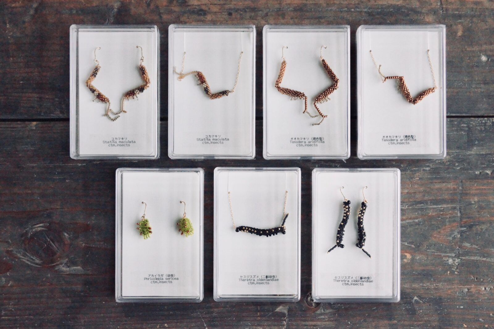 透明感のある水菓子のようなデザインのアカイラガ幼虫、尾角(通称“ピコピコ”)が特徴的なセスジスズメの2齢幼虫といったマニアックなモチーフは、芋虫らしいリアルさをビーズの柔らかい雰囲気でコーティングした絶妙な再現度が◎。