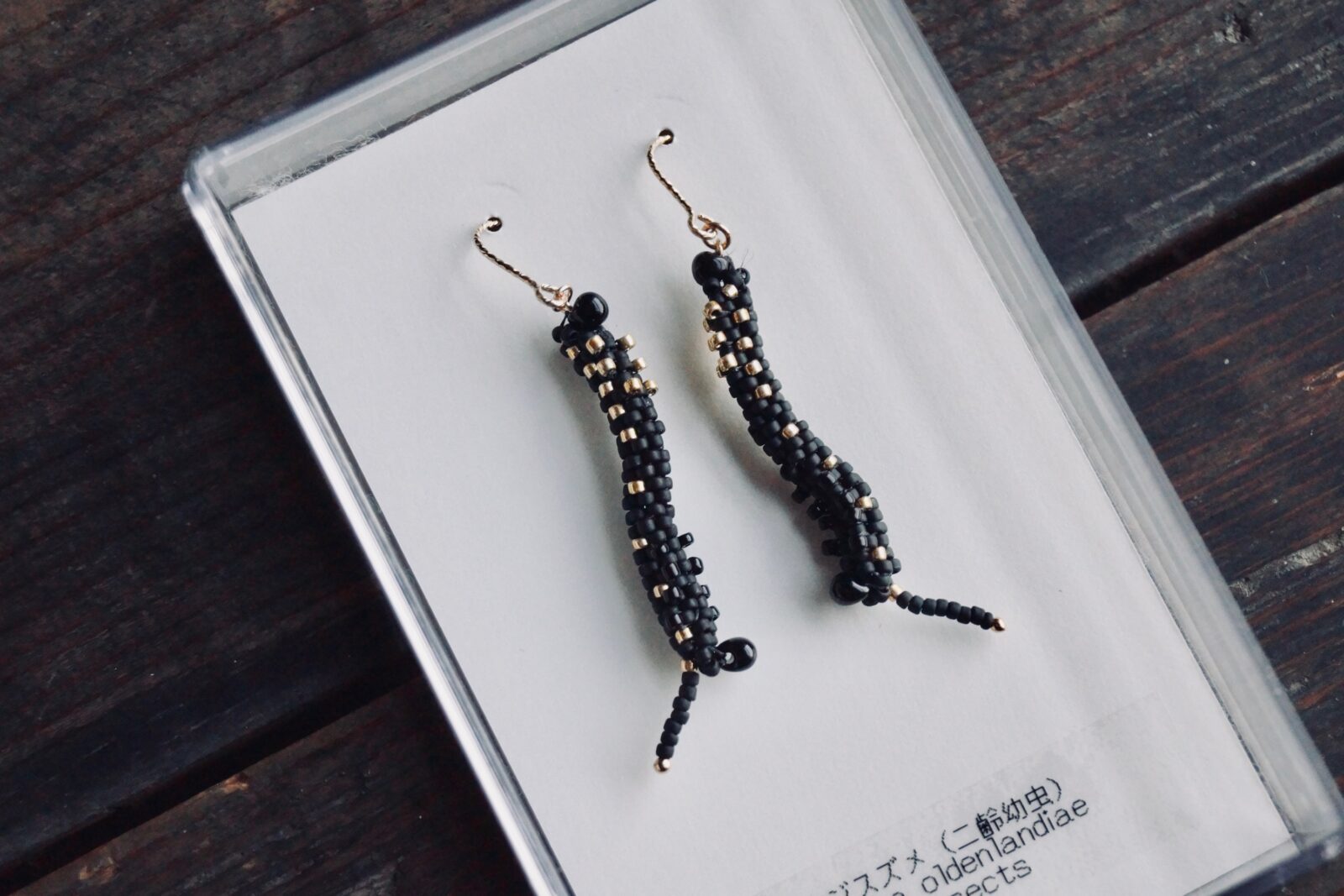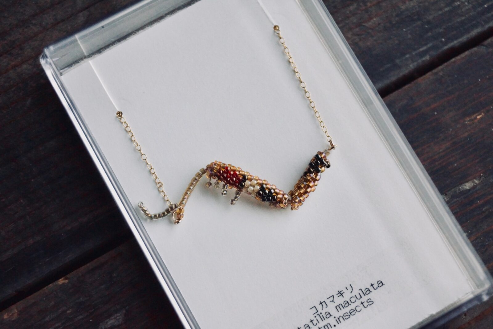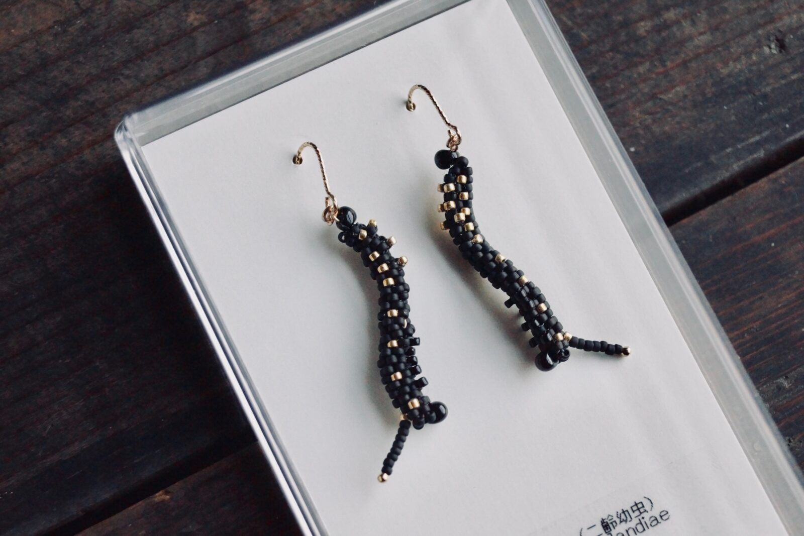 透明感のある水菓子のようなデザインのアカイラガ幼虫、尾角(通称“ピコピコ”)が特徴的なセスジスズメの2齢幼虫といったマニアックなモチーフは、芋虫らしいリアルさをビーズの柔らかい雰囲気でコーティングした絶妙な再現度が◎。
