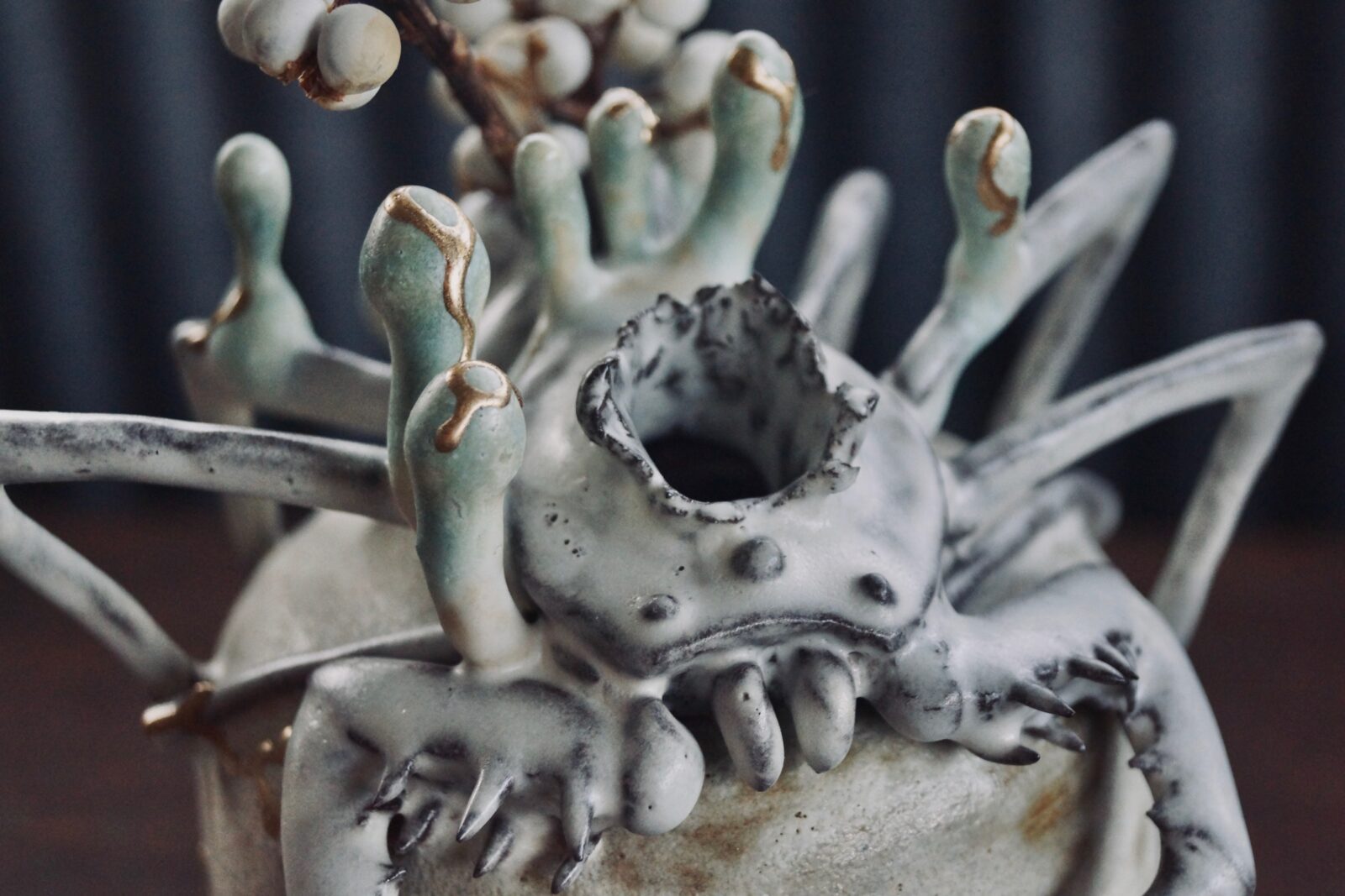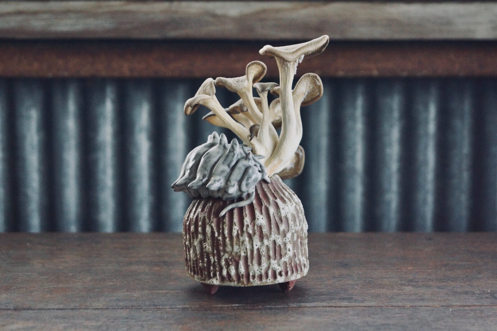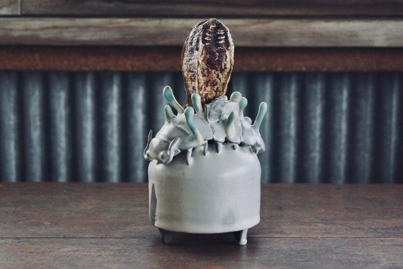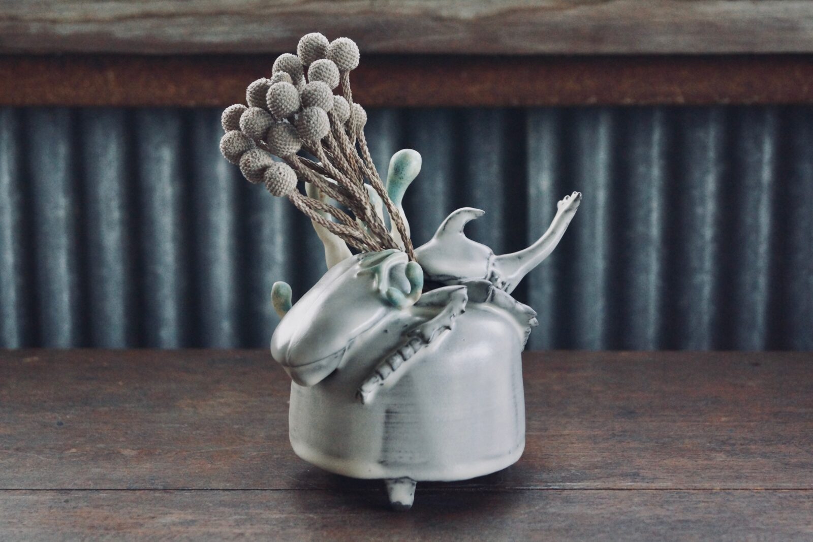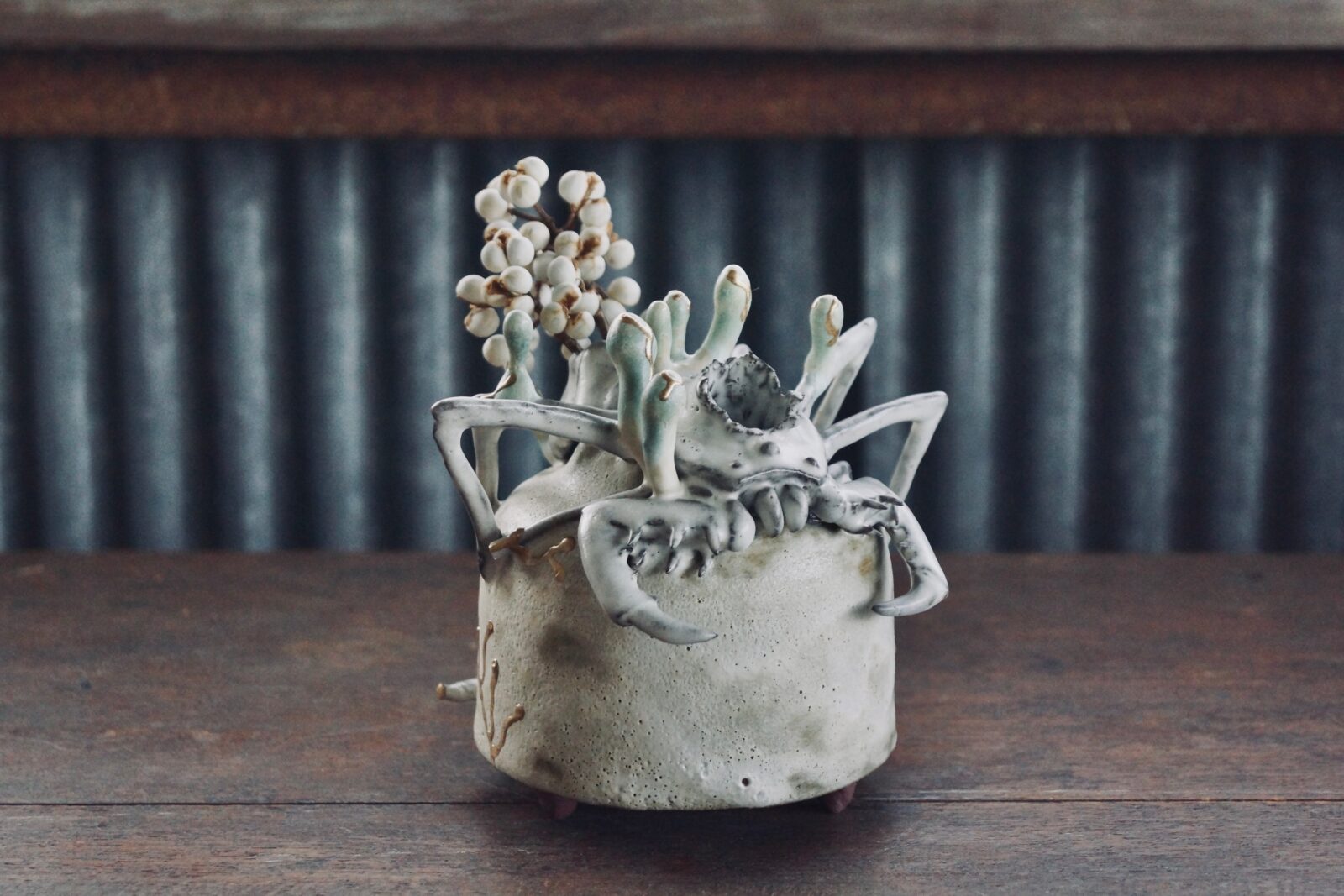 苗床である〝蟲〟が菌に侵されながら朽ちてゆく姿をモチーフとした鉢本体と、植え込んだ植物が共に育つ過程をお楽しみいただける陶蟲夏草鉢シリーズ。