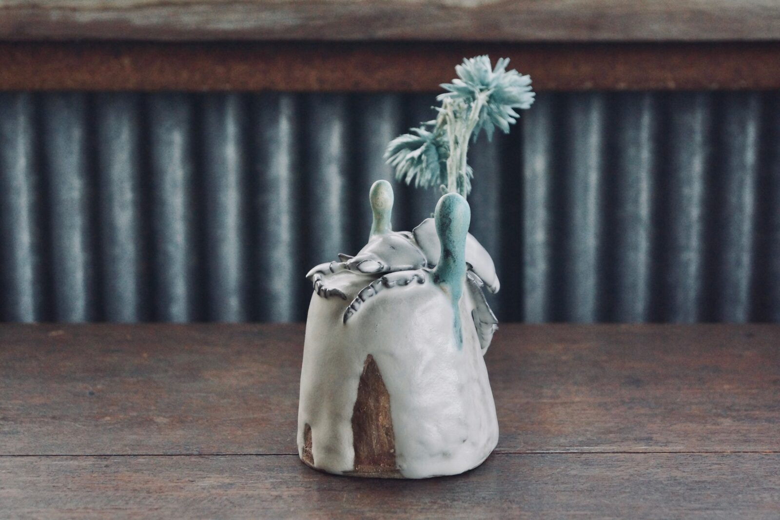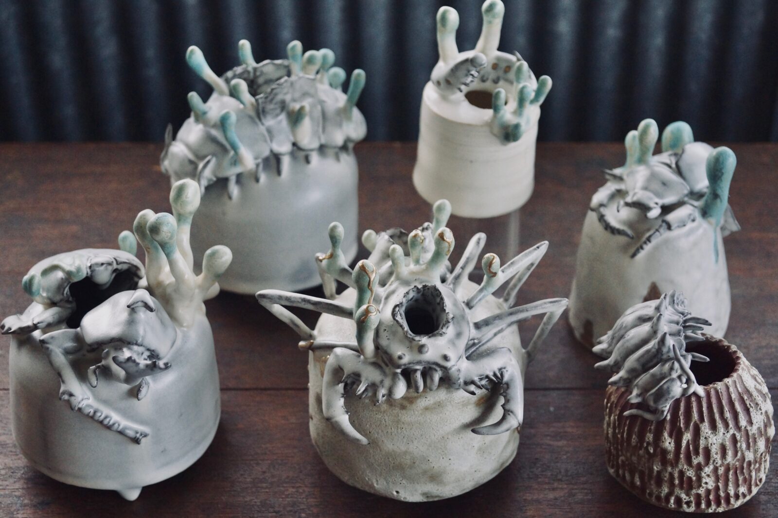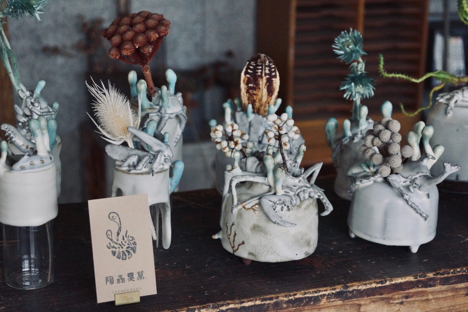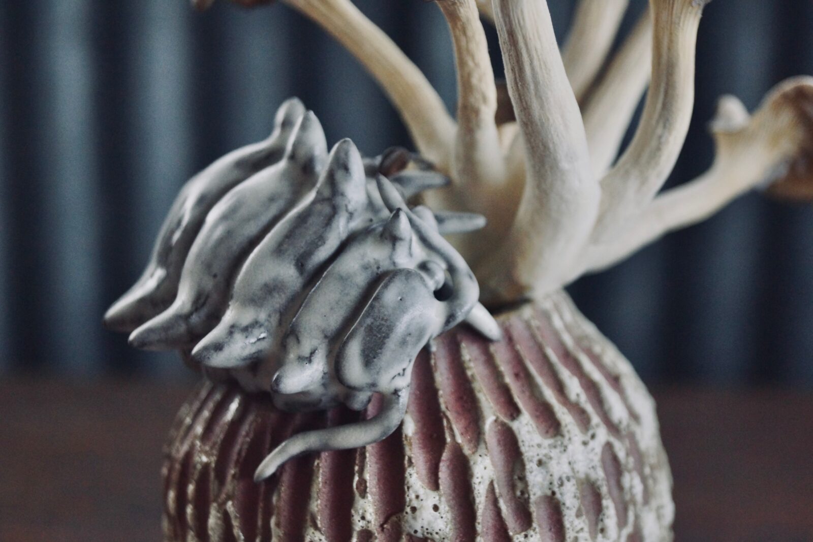 苗床である〝蟲〟が菌に侵されながら朽ちてゆく姿をモチーフとした鉢本体と、植え込んだ植物が共に育つ過程をお楽しみいただける陶蟲夏草鉢シリーズ。