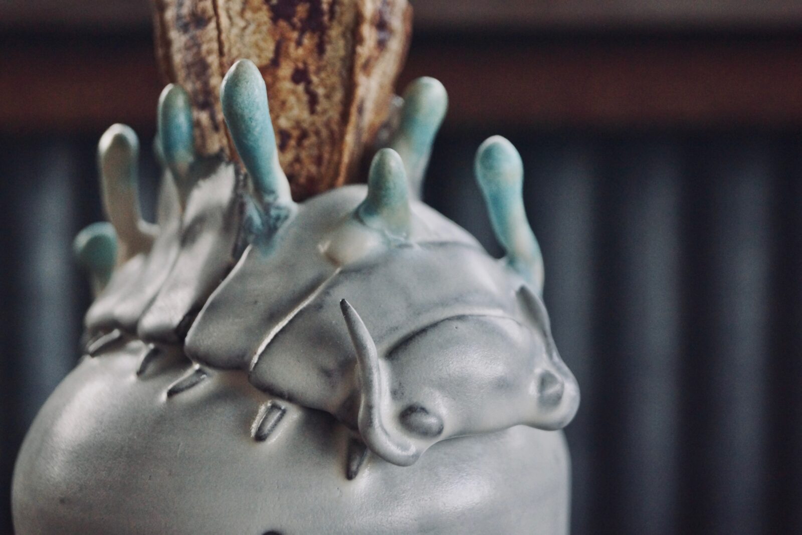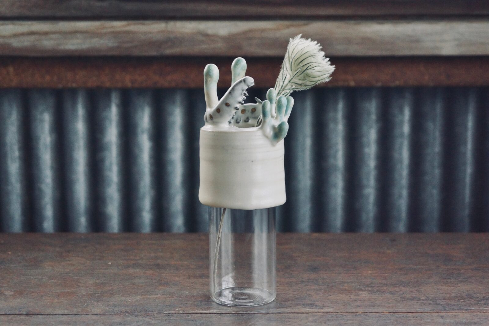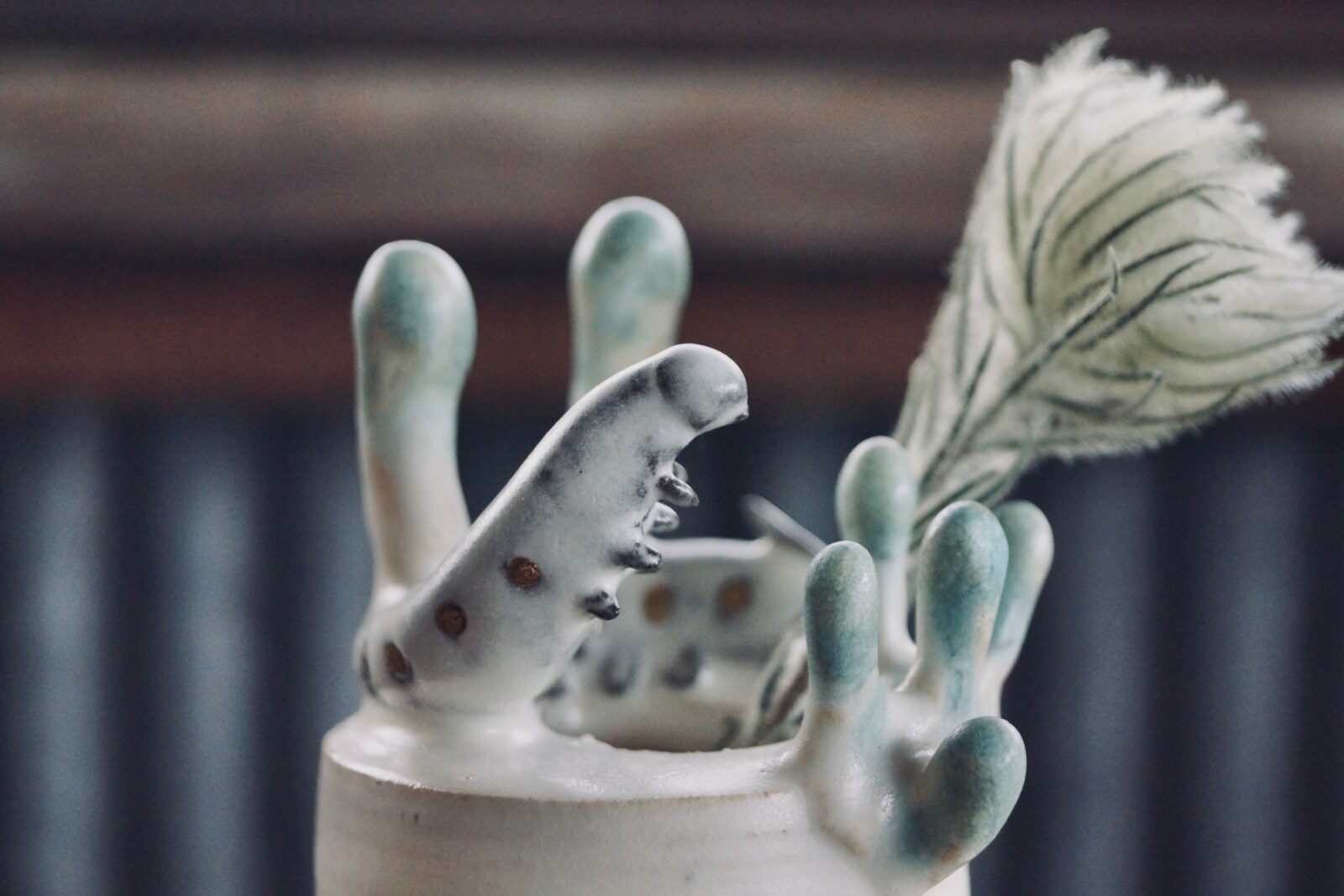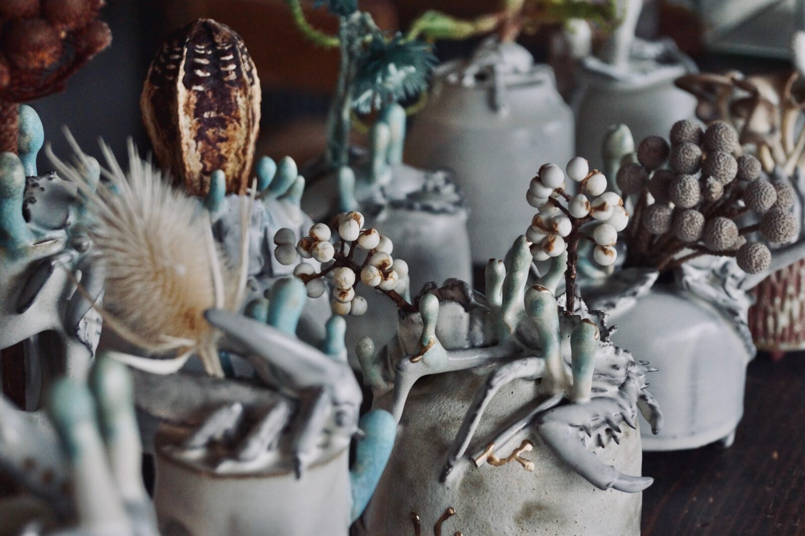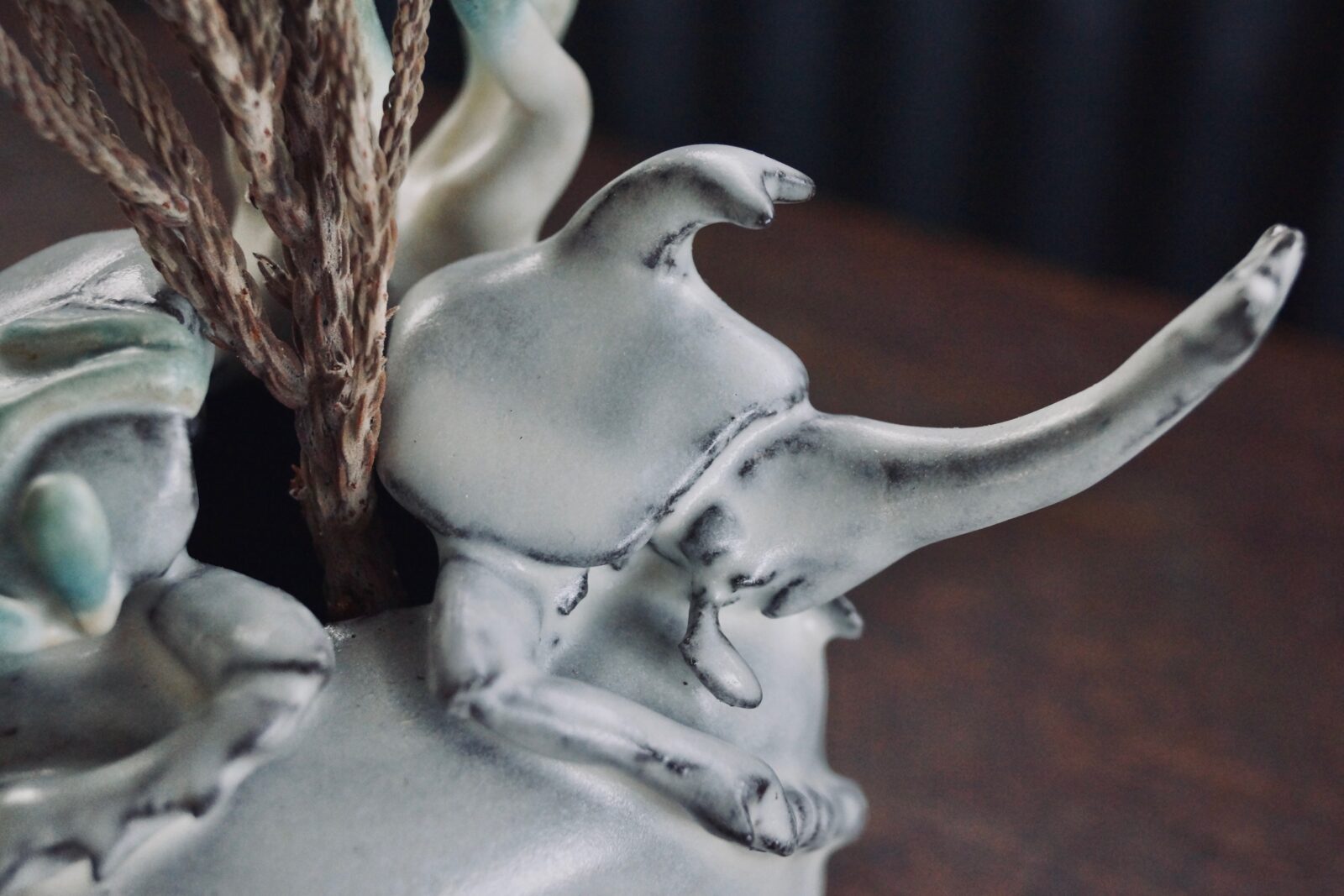 苗床である〝蟲〟が菌に侵されながら朽ちてゆく姿をモチーフとした鉢本体と、植え込んだ植物が共に育つ過程をお楽しみいただける陶蟲夏草鉢シリーズ。