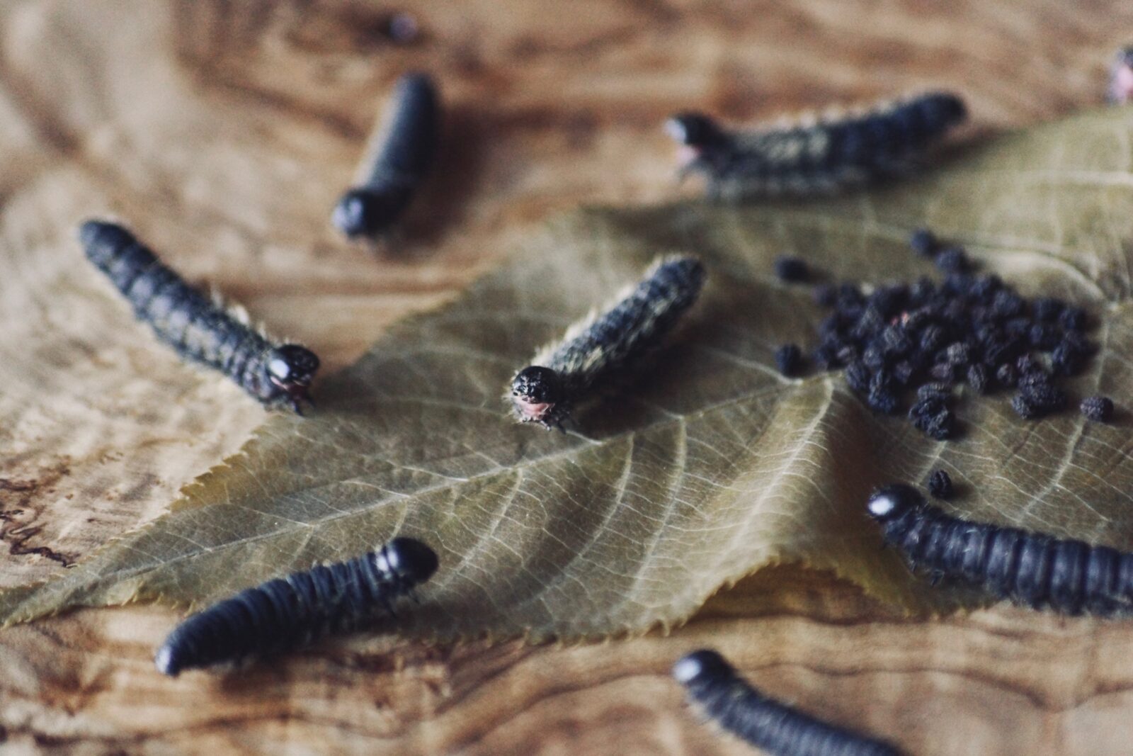 新鮮な桜の葉をモリモリと平らげる桜毛虫から排出される糞は数時間おきに回収し、しっかり乾燥させてから残渣(葉柄や脱皮殻など)を丁寧に除去。