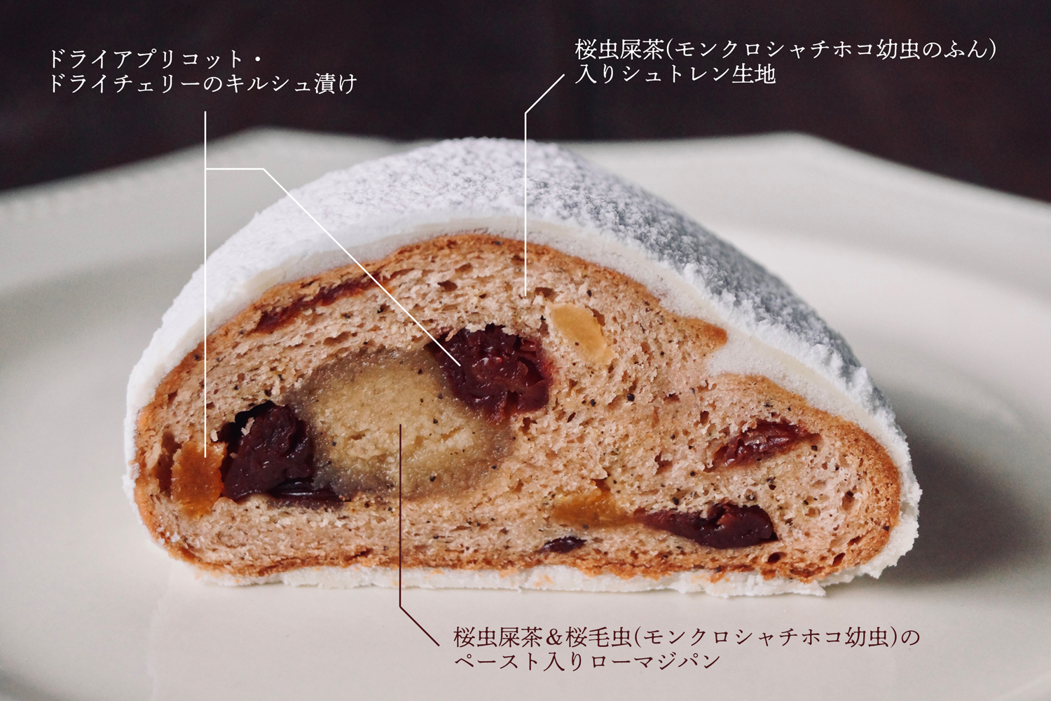 今回お届けするシュトレンには、そんなモンクロシャチホコの幼虫本体と糞(桜虫屎茶)をW使用しました。